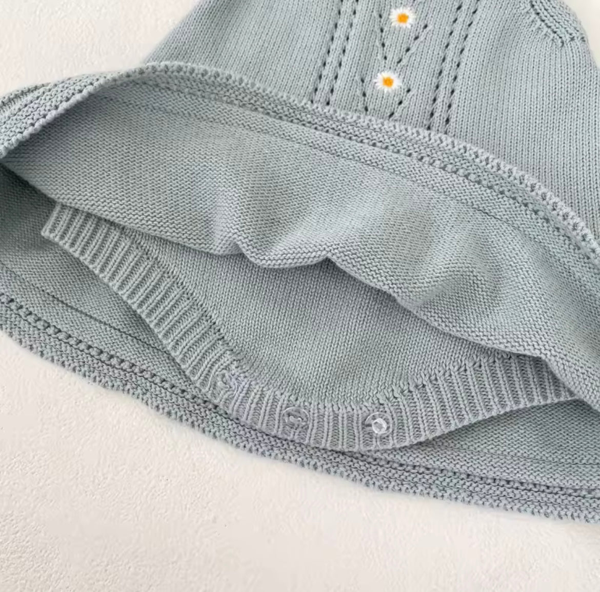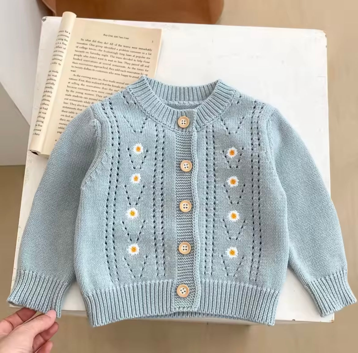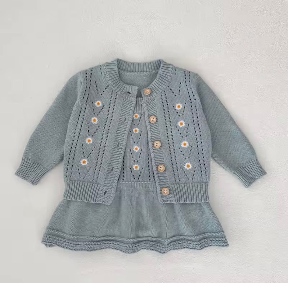 This blue floral knitted dress and cardigan set is perfect for your little one. Made with a romper built into the dress, it provides comfort and convenience. The blue color and cute embroidered flowers add a charming touch. Ideal for babies and toddlers, it's an adorable addition to any wardrobe.