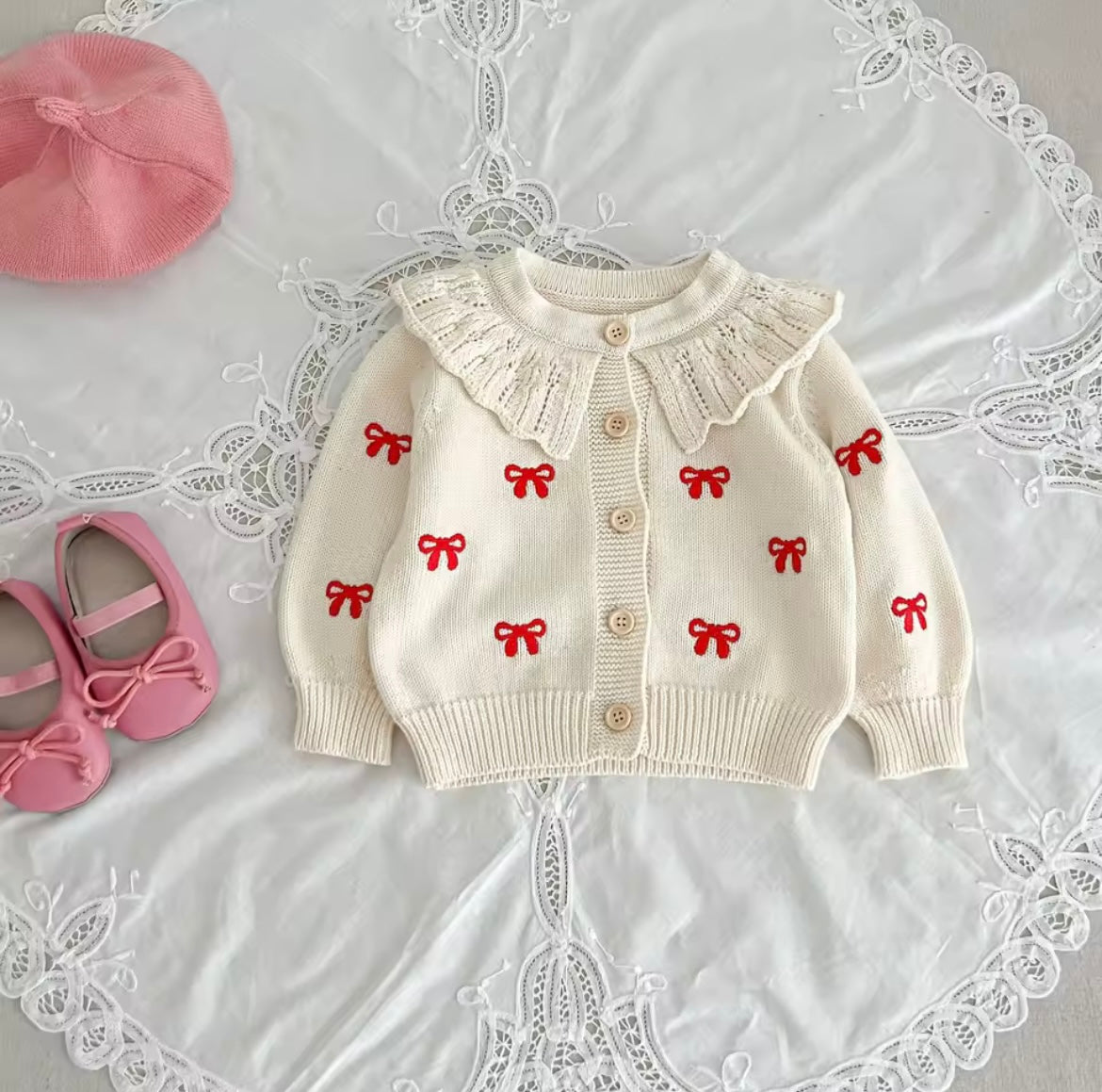 This charming cream cardigan and romper set features delightful red bow accents that add a touch of whimsy to your little one’s outfit. The romper pairs perfectly with the matching cardigan, but each piece can also be purchased separately for mix-and-match fun. Soft, cozy, and cute—this duo is perfect for playful days and special moments alike.