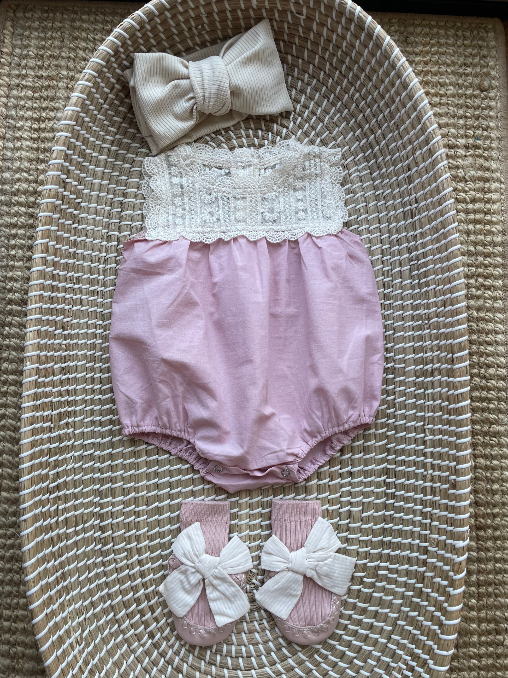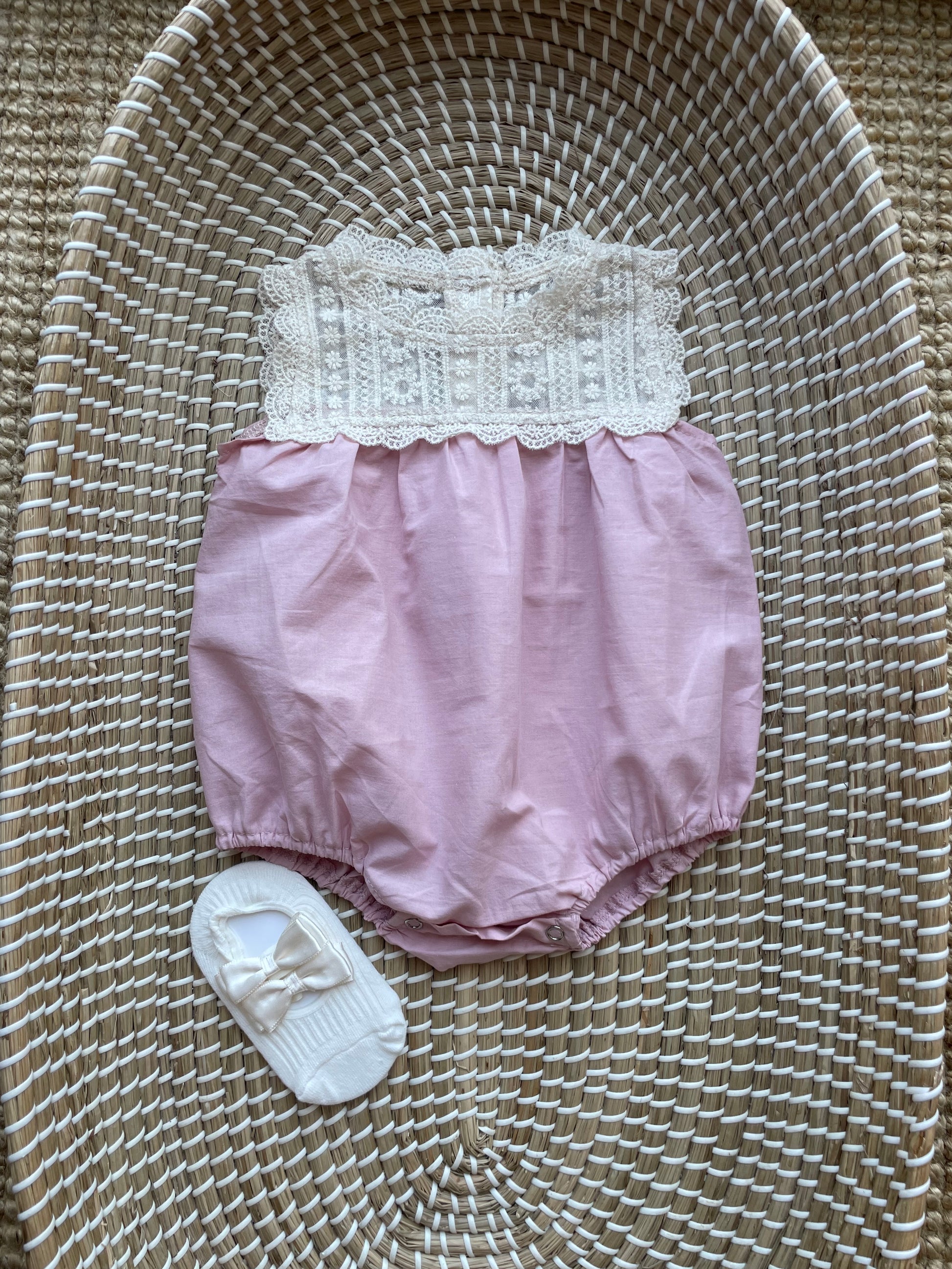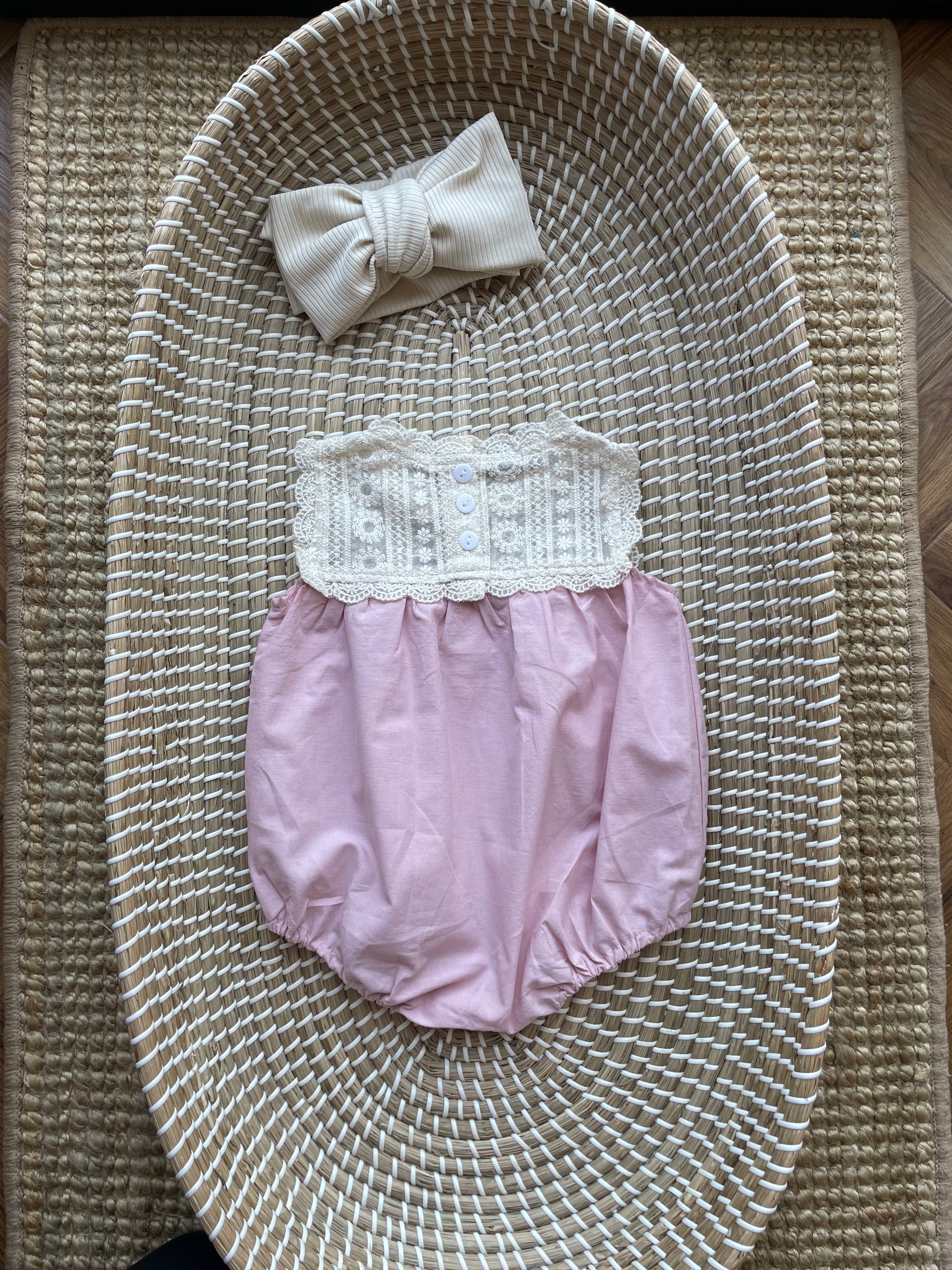 This adorable baby romper combines soft pink cotton with charming creamy crochet details for a delicate, lightweight feel. Perfect for keeping your little one comfy and stylish during playtime or naptime, its breathable fabric ensures all-day comfiness with a touch of sweet, handmade charm.