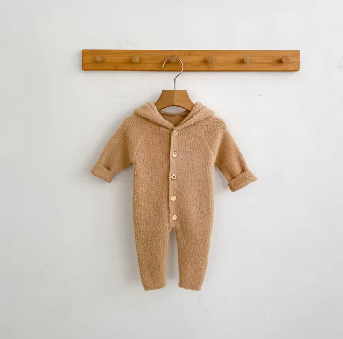 This fluffy bunny onesie is the perfect blend of comfort and cuteness for your little one. With soft, plush fabric and charming bunny ears on the hood, it adds a playful touch to any day. The convenient buttons down the center make dressing easy and quick, keeping your baby cozy and happy.