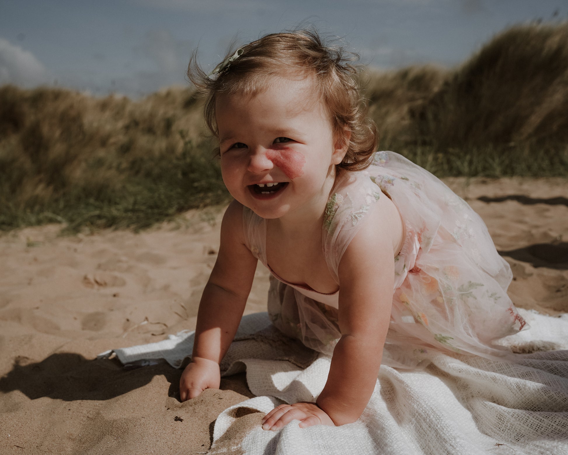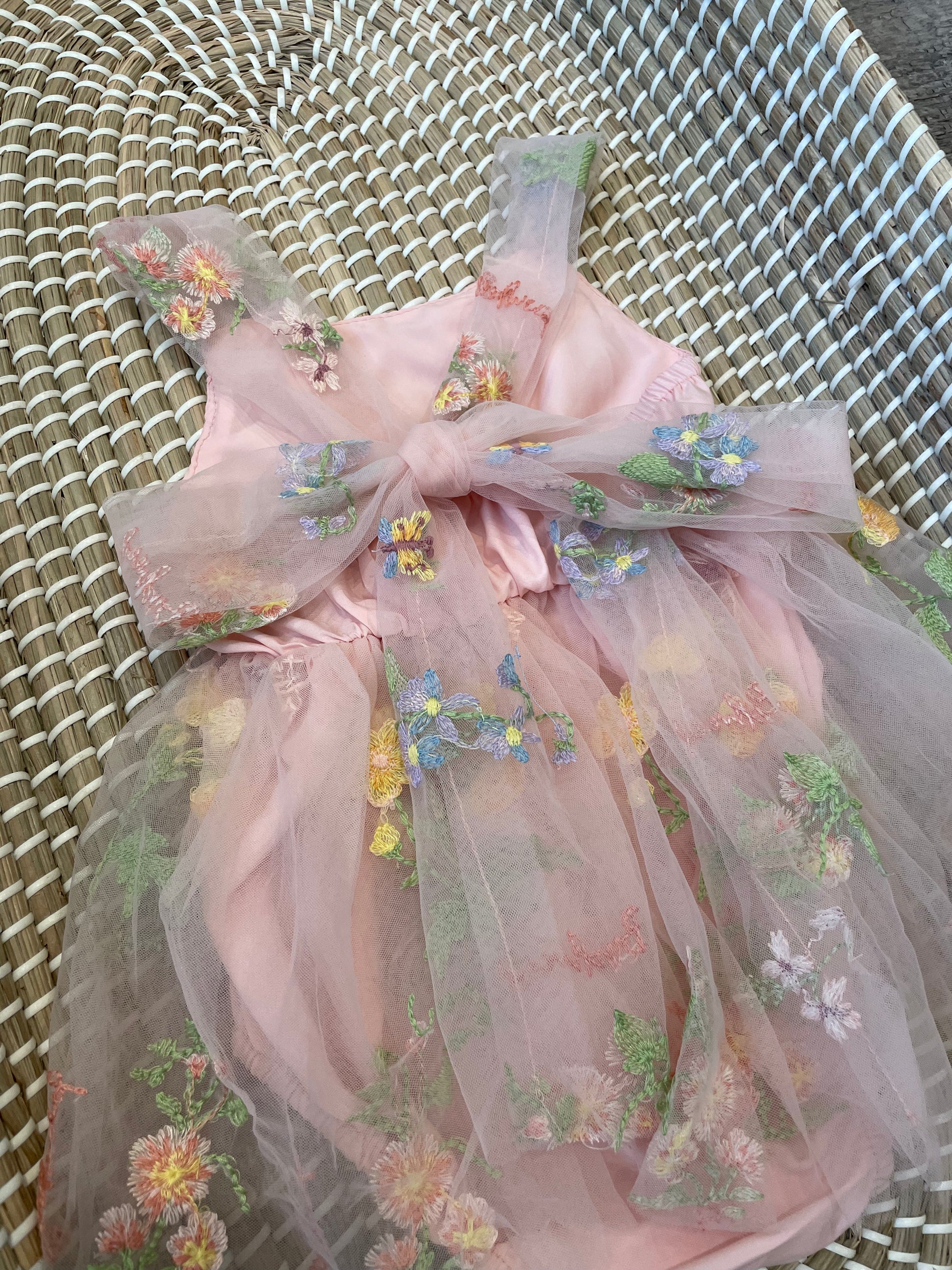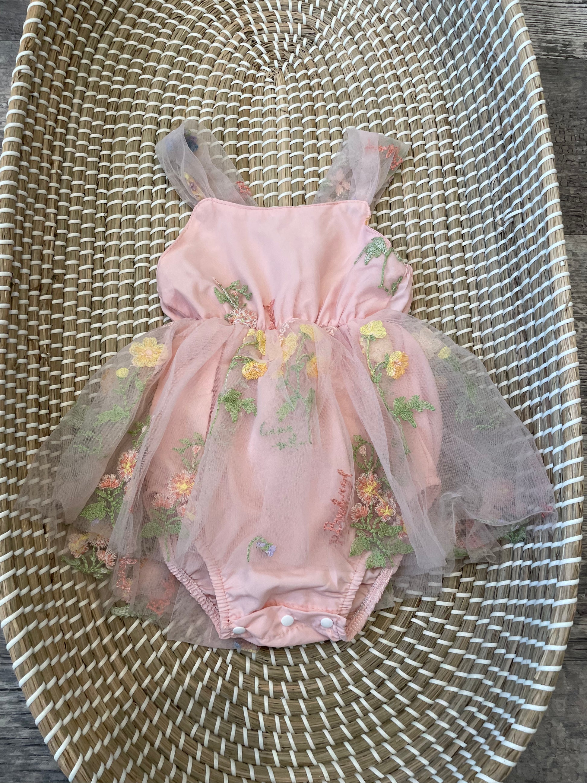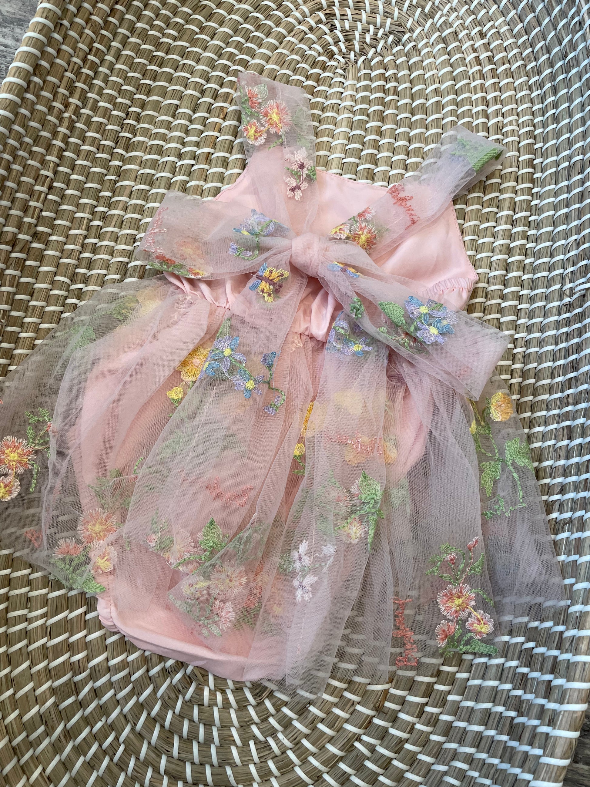 This stunning, embroidered pink tulle romper is one of our favourites so far! It’s beautiful, it has hand embroidered flowers and writing on and a really lovely tie detail at the back. It has press stud fastenings at the bottom for easy changing.