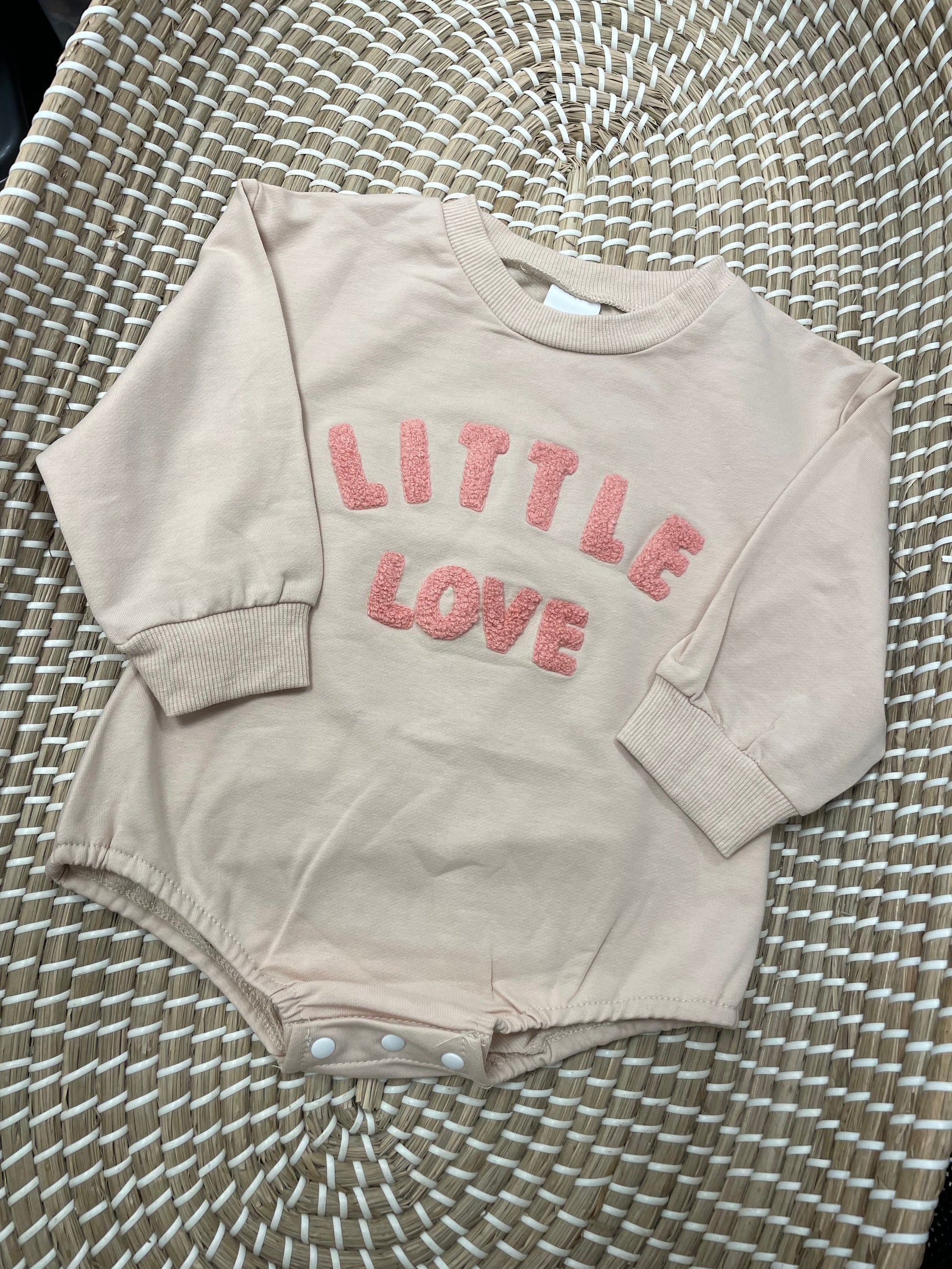 Get your little one dressed in style with our "Little Love" romper in peach! This adorable romper features long sleeves, perfect for cooler days. The peach and pink color combination adds a sweet touch, while the cute font adds a playful twist. The perfect addition to your baby's wardrobe!