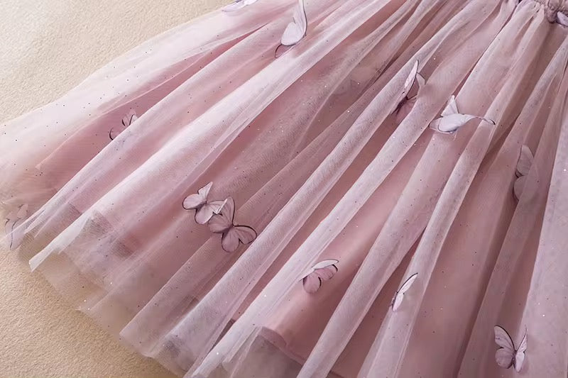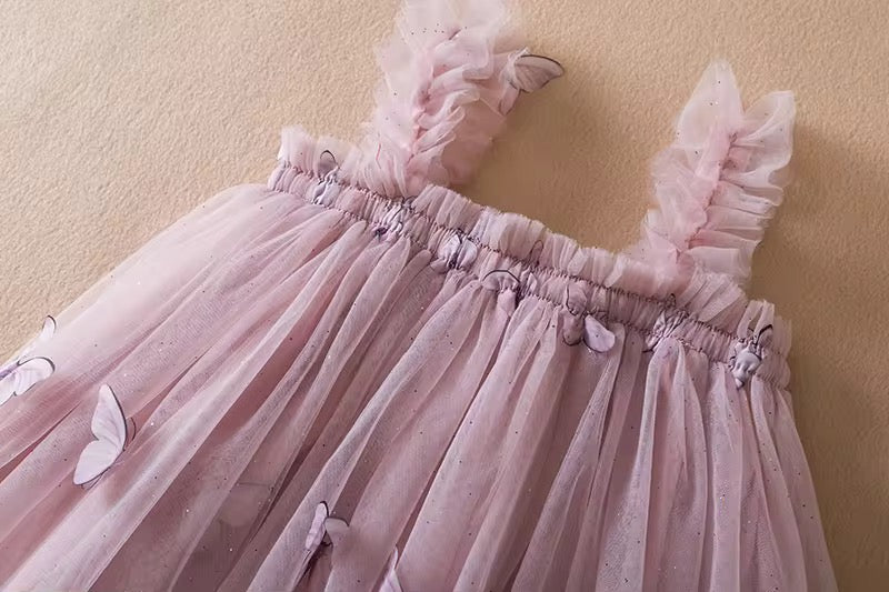 A stunning pink butterfly dress. This dress is so charming, the butterflies really pop! The tulle overlay is super soft making this a perfect party dress for your little one.