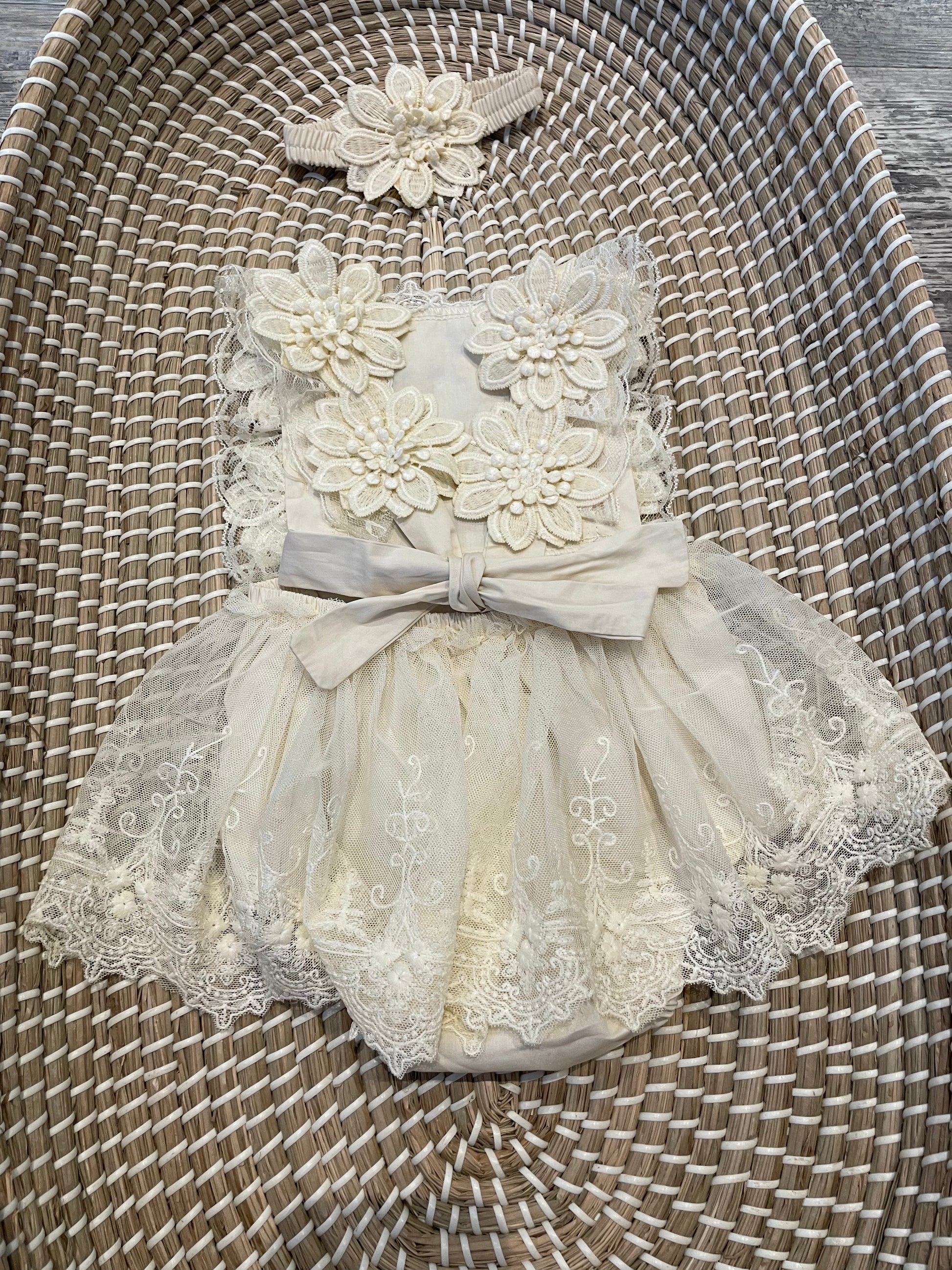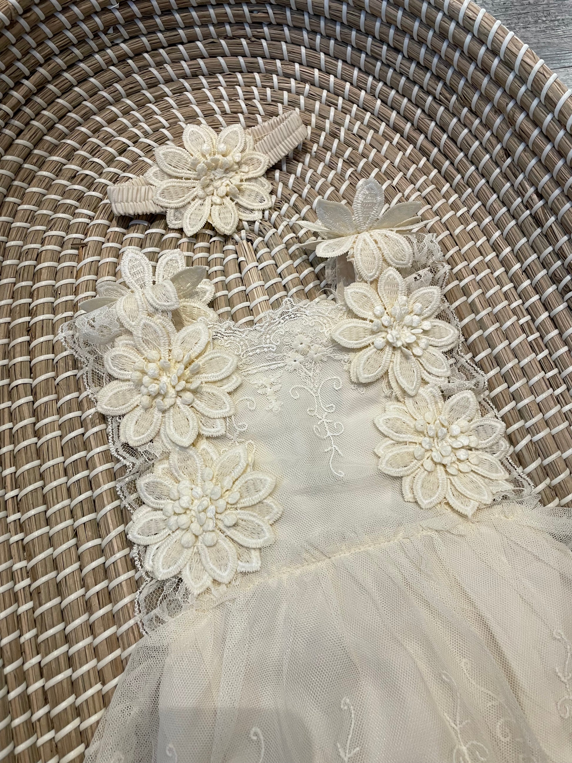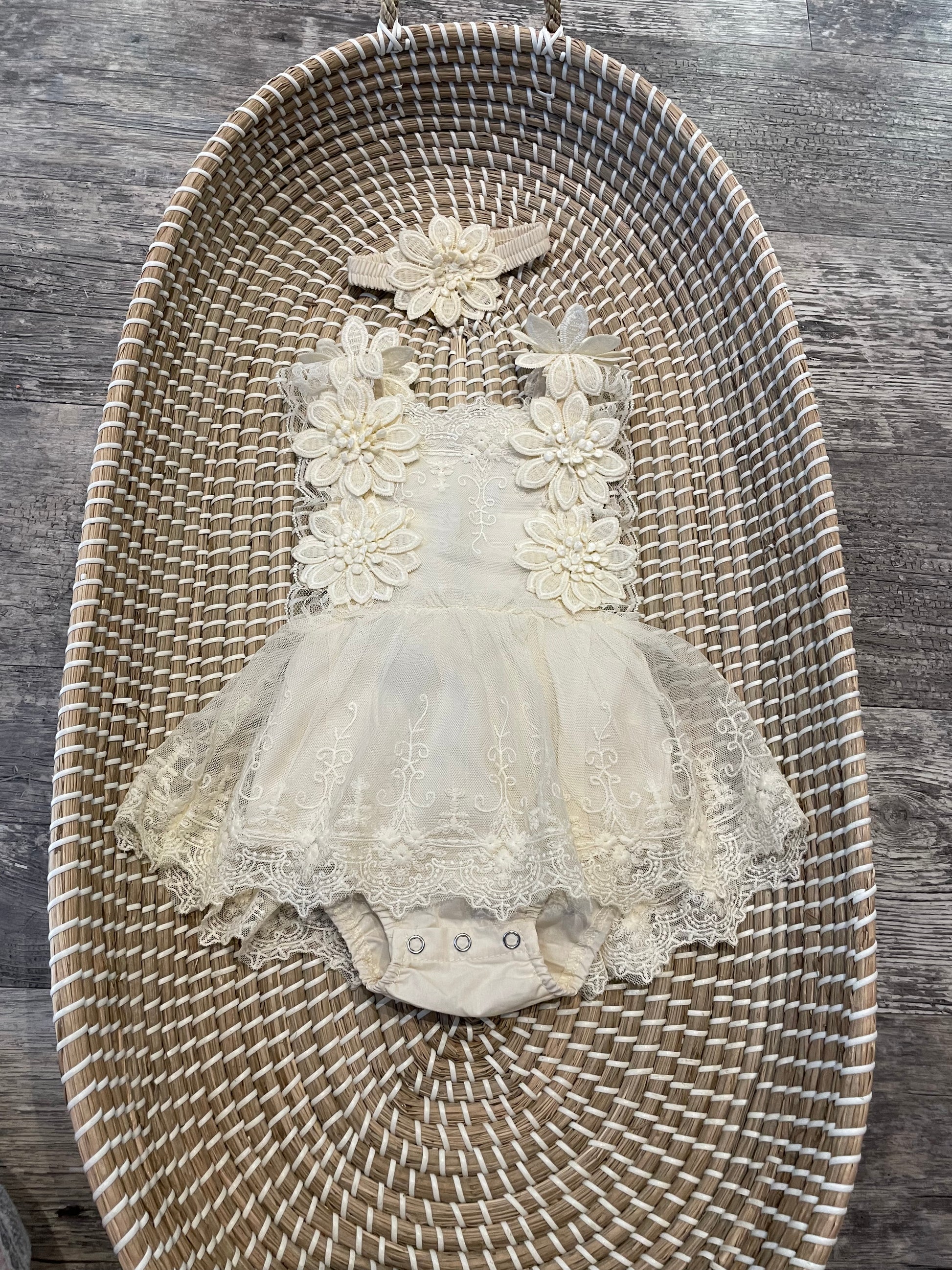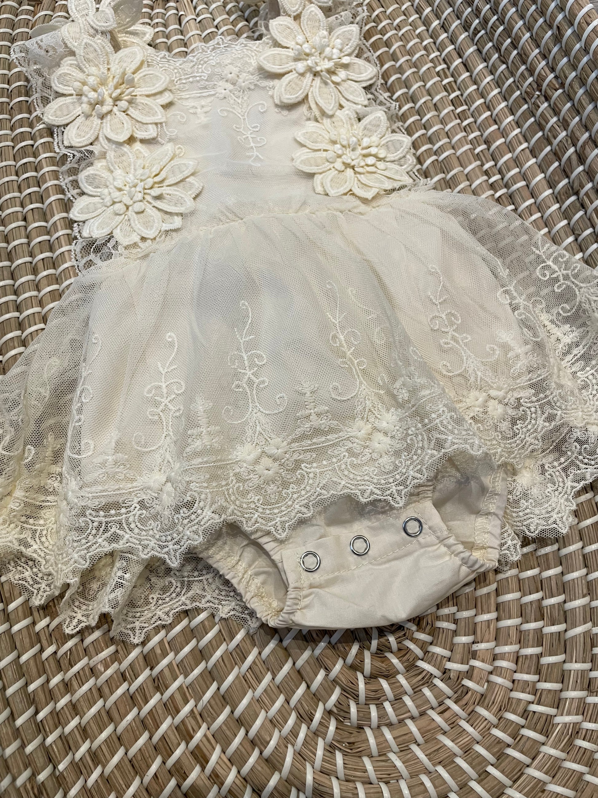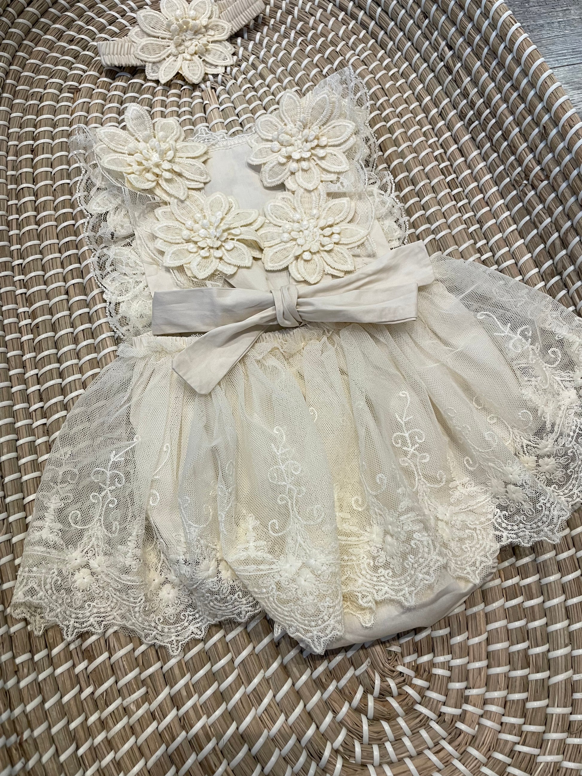 A stunning neutral cream and pink romper, giving all the boho vibes. Beautiful flowers are stitched on the front and over the straps, with an intricate lace detail overlay. We particularly love all of the details to the tie back. It even comes with an adorable matching headband.
