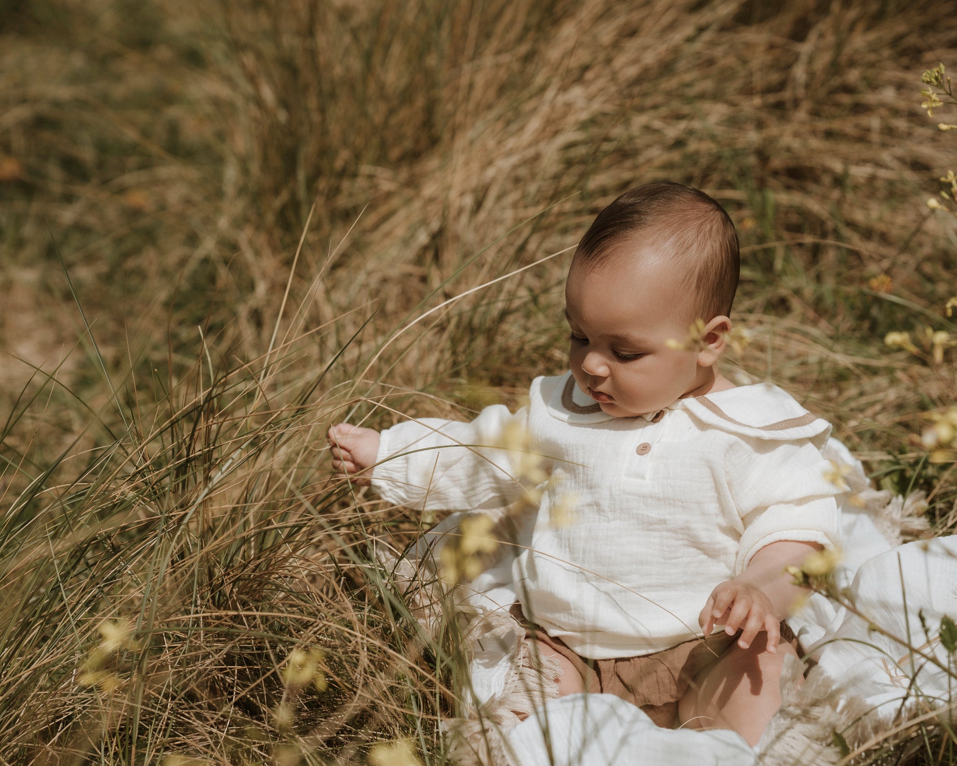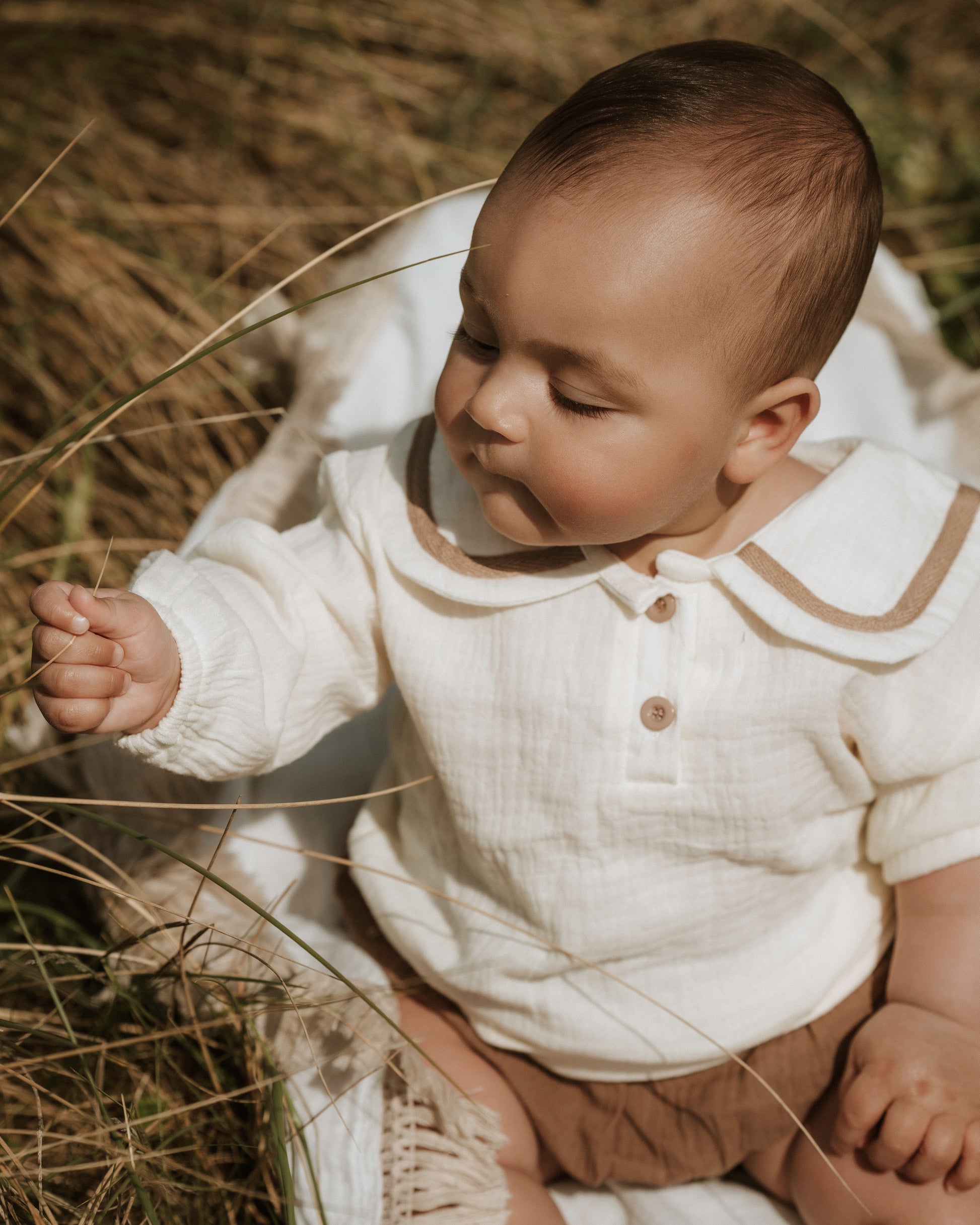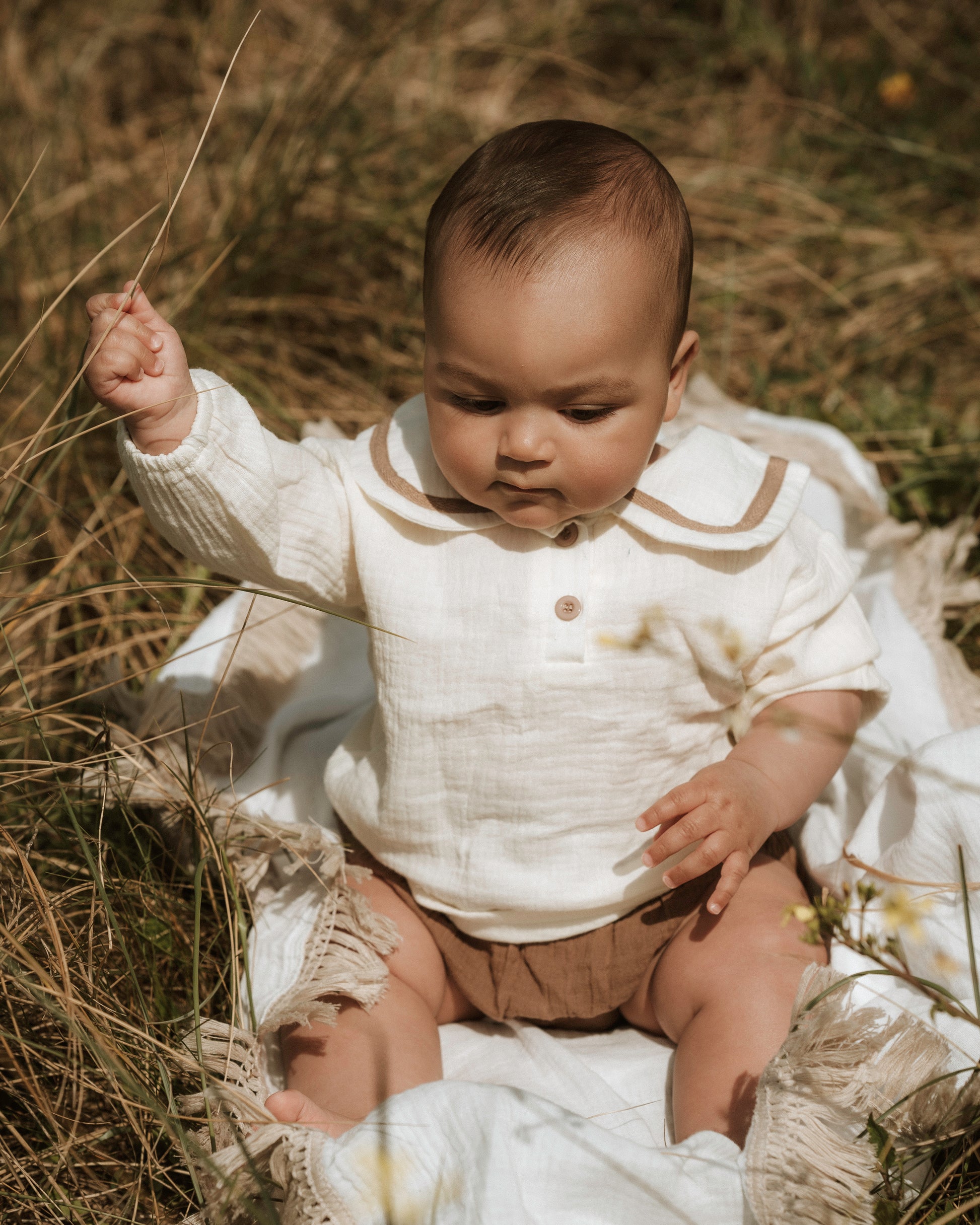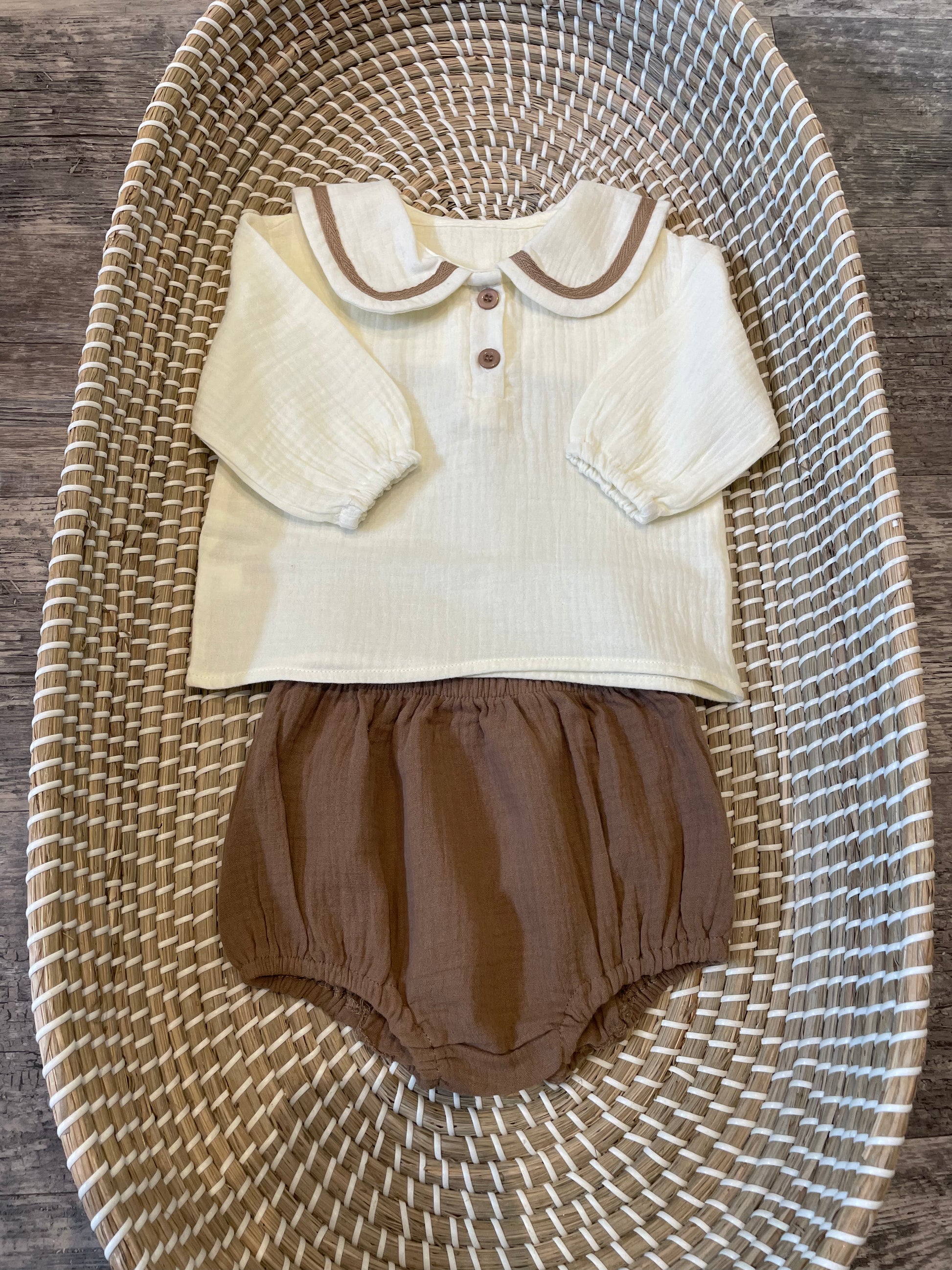 This beautiful 2pc muslin set is perfect for any occasion. We love the sailor collar and the unique colour tones in the set. The top is a lemon/cream colour and the bottoms a deeper beige. A neutral set not to be missed!