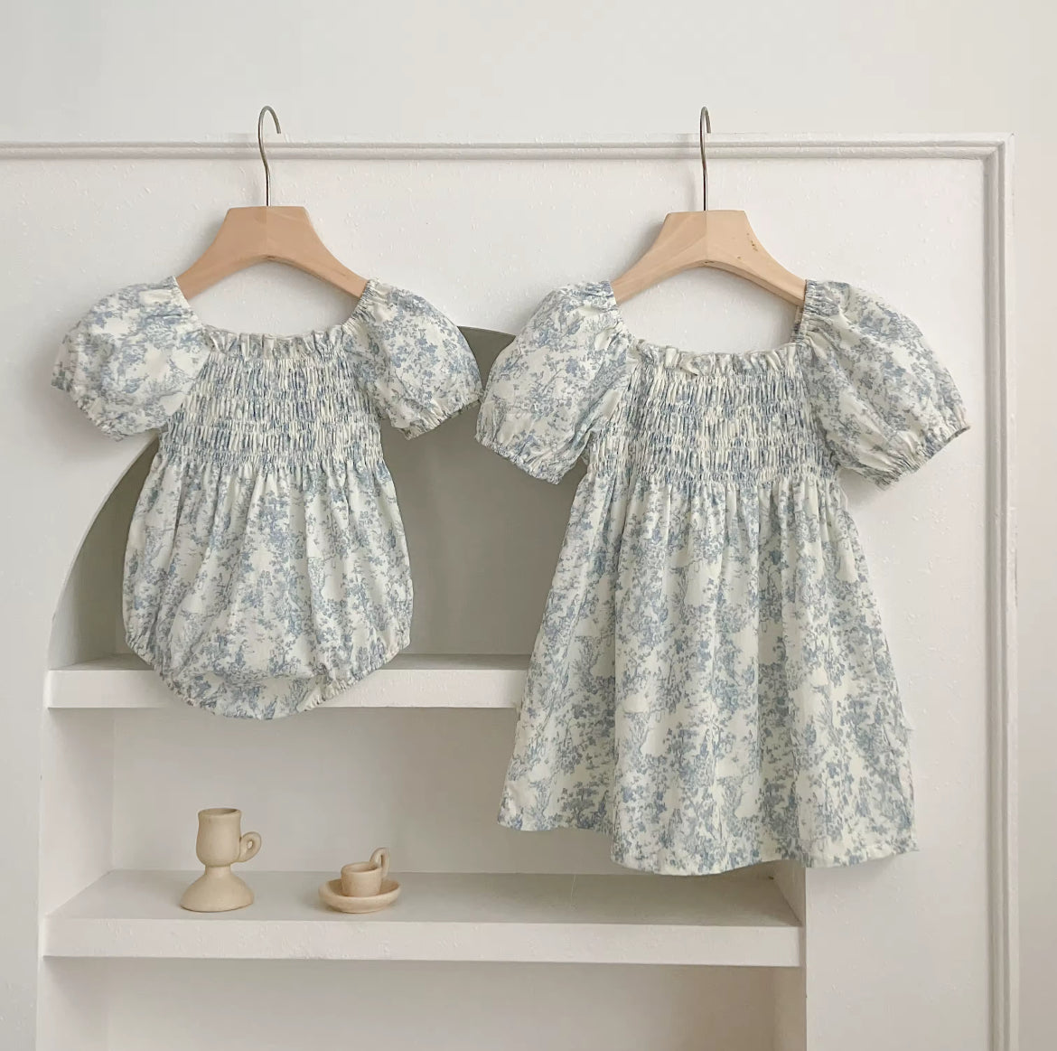 The Fifi Dress is a charming blue floral cotton dress perfect for your little one’s playful days. Soft and breathable, it keeps toddlers comfy while looking adorable. Don’t forget to check out the matching sister romper for a sweet coordinated look!