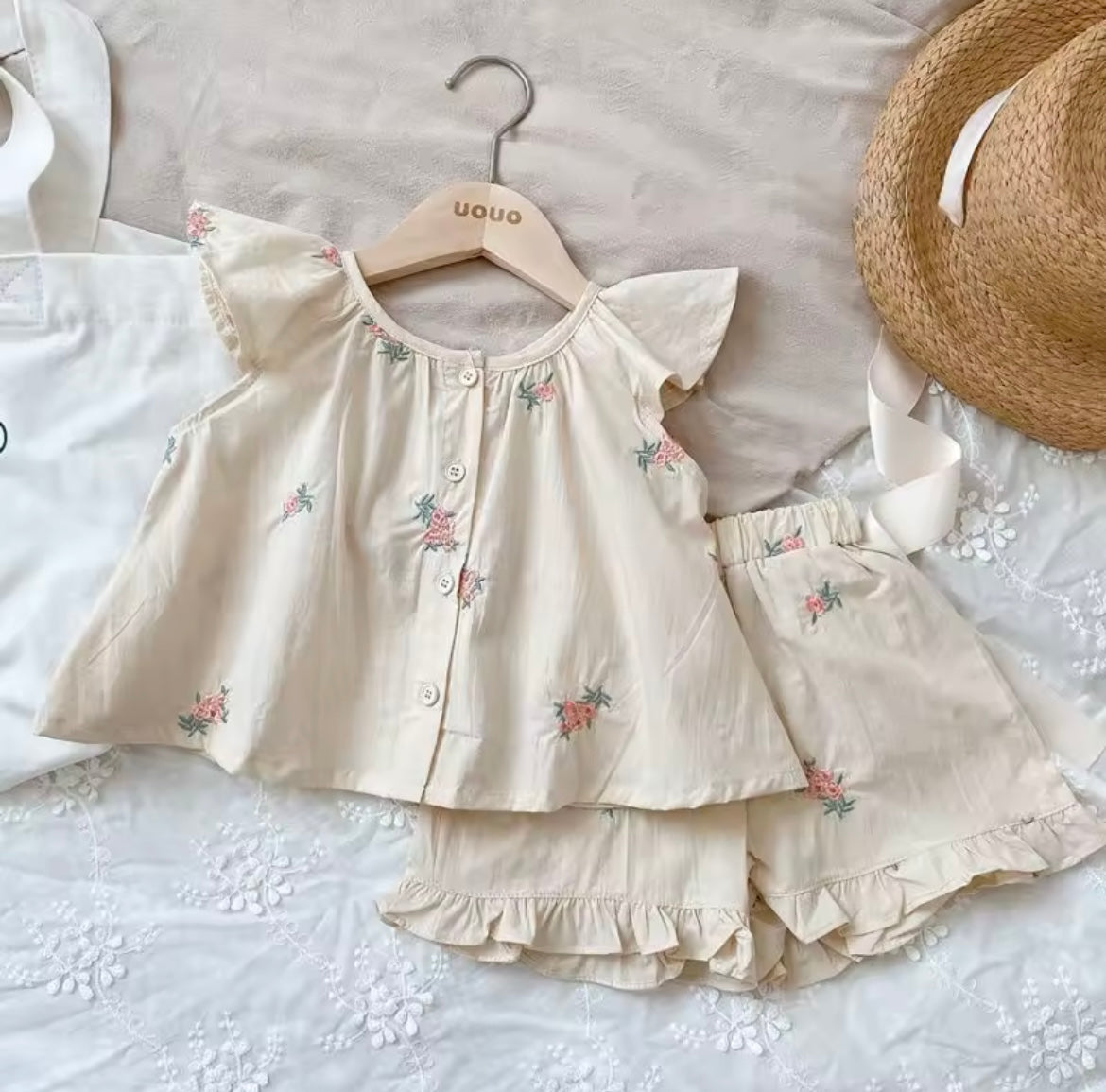 This dreamy cream cotton shorts set is perfect for toddlers who love a touch of floral fun. Featuring charming embroidered flowers, it offers a soft, breathable fit that keeps little ones comfortable while they play and explore. Brighten up their wardrobe with this playful and sweet outfit.