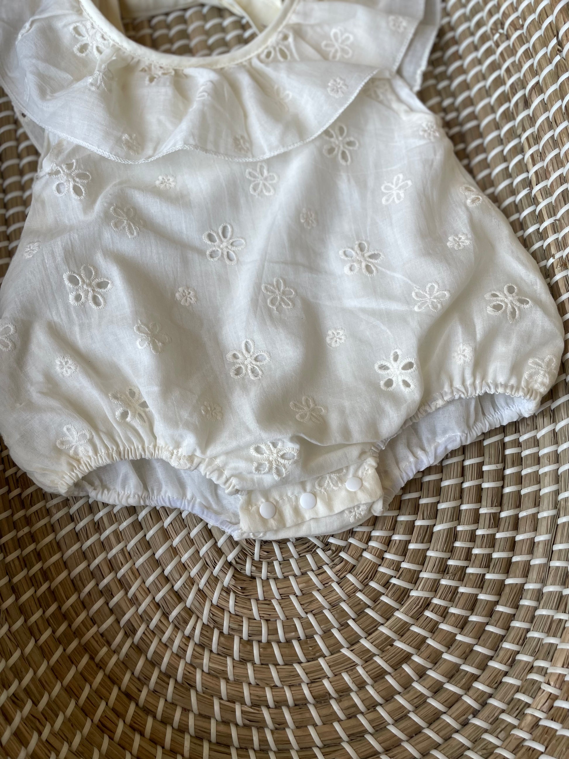 The Lila romper is a charming cream cotton outfit featuring a delightful oversized frill that adds a touch of whimsy. Designed for easy dressing, it includes convenient press stud fastenings, making changes quick and fuss-free. Perfect for keeping your little one comfy and cute all day long!